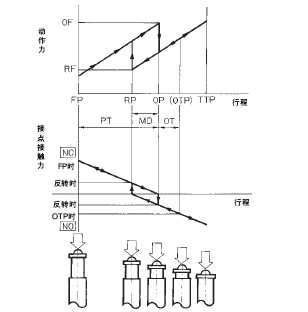 限位開(kāi)關(guān) 使用注意事項(xiàng)● 關(guān)于開(kāi)關(guān)的使用· 實(shí)際使用開(kāi)關(guān)時(shí),可能會(huì)發(fā)生意想不到的問(wèn)題。因此,應(yīng)在可能實(shí)施的范圍內(nèi)進(jìn)行測(cè)試。 關(guān)于動(dòng)作力、行程、接觸特性 · 圖中所示為動(dòng)作力→行程→接點(diǎn)接觸力的關(guān)系。為保證高度的可靠性,必須在合適的接觸力范圍內(nèi)使用。使用常時(shí)閉路(NC) 時(shí)操作體的設(shè)置必須保證驅(qū)動(dòng)桿能返回自由位置。此外,使用常時(shí)開(kāi)路(NO)時(shí),必須按下到過(guò)行程(OT)的規(guī)定值的70~100% (總行程(TT)的60~80%),以吸收微小的擺振和誤差。 ![]() · 若驅(qū)動(dòng)桿經(jīng)常處于按下?tīng)顟B(tài),會(huì)造成初期故障、復(fù)位不良,請(qǐng)定期維護(hù)及更換。 關(guān)于選擇時(shí)的機(jī)械條件 · 必須根據(jù)操作方式來(lái)選擇驅(qū)動(dòng)桿。 · 請(qǐng)確認(rèn)操作速度和操作頻率。 ● 電氣注意事項(xiàng) 關(guān)于選擇時(shí)的電氣條件 · 交流和直流的開(kāi)關(guān)能力相差很大, 因此請(qǐng)?jiān)陬~定范圍內(nèi)使用。直流的場(chǎng)合、控制容量極低。這主要是由于它不像交流那樣有零點(diǎn)(電流零交點(diǎn)), 一旦產(chǎn)生電弧就很難消失,電弧時(shí)間較長(zhǎng)。而且電流方向是固定的, 因此會(huì)出現(xiàn)接點(diǎn)的遷移現(xiàn)象, 從而因凹凸不平而導(dǎo)致接點(diǎn)無(wú)法斷開(kāi)。 ● 關(guān)于接點(diǎn)保護(hù)電路 為了延長(zhǎng)接點(diǎn)壽命、防止噪聲、及減少因電弧而產(chǎn)生的碳化物或硝酸, 請(qǐng)使用接點(diǎn)保護(hù)電路。但是如果使用不正確, 可能會(huì)適得其反。