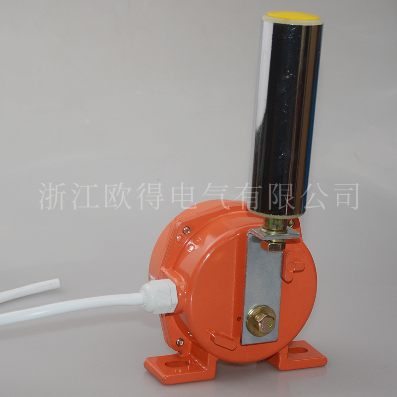 兩級跑偏開關(guān)(JPKJ-S),絕緣電壓400伏,發(fā)熱電流10安培,工作電壓電流交流380伏、2.6安培,直流220伏、0.4安培,防護等級IP65。主要用于輸送機膠帶跑偏檢測,防止膠帶跑偏而造成物料溢出等故障。當(dāng)膠帶發(fā)生跑偏時,膠帶邊緣帶動立棍旋轉(zhuǎn)并擠壓立棍使之傾斜。若立棍傾斜大于一級動作角度時,開關(guān)便發(fā)出一組信號用于警告,若立棍傾斜大于二級動作角度時,開關(guān)便發(fā)出另一組信號用于停機。膠帶機恢復(fù)正常運行后,立棍自動復(fù)位。